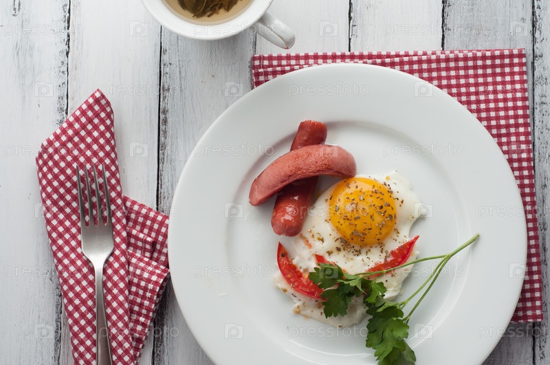 Яичница с кусочками помидора и колбасой на тарелке