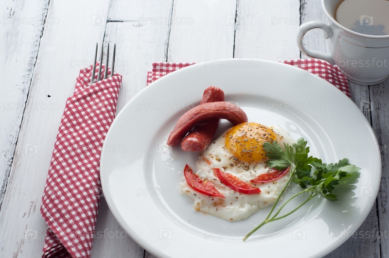 Яичница с кусочками помидора и колбасой на тарелке