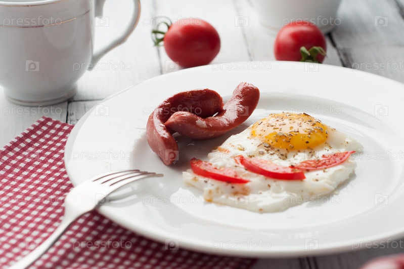Яичница с кусочками помидора и колбасой на тарелке