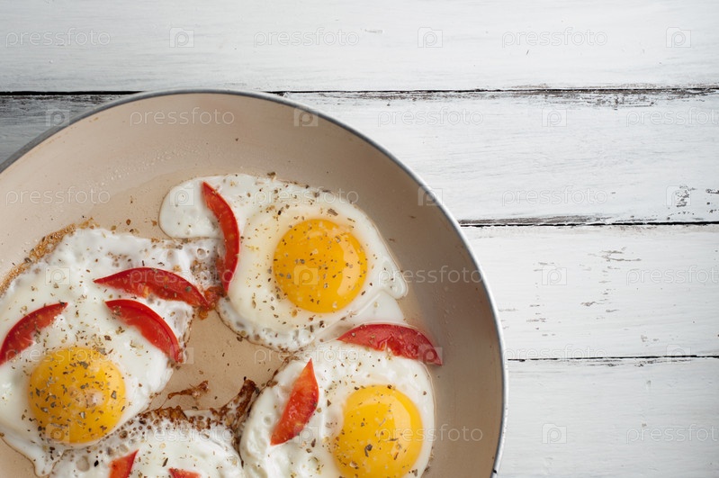 Горячая сковорода с яичницей и мелкими кусочкамии помидора