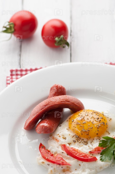 Яичница с кусочками помидора и колбасой на тарелке