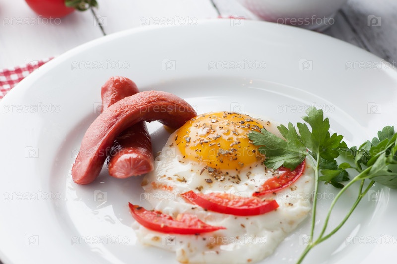 Яичница с кусочками помидора и колбасой на тарелке