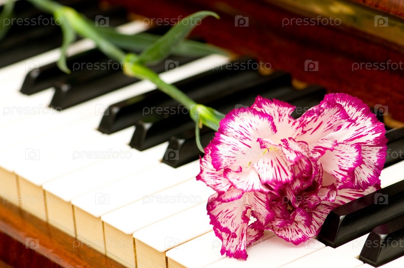 Романтическая концепция - красный гвоздик на клавишах фортепиано