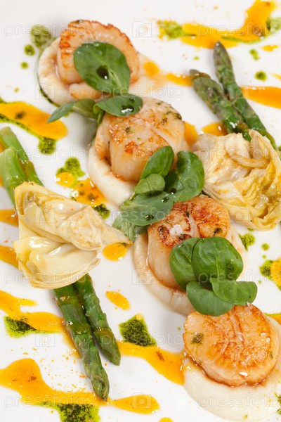 Запеченные морские гребешки со спаржей