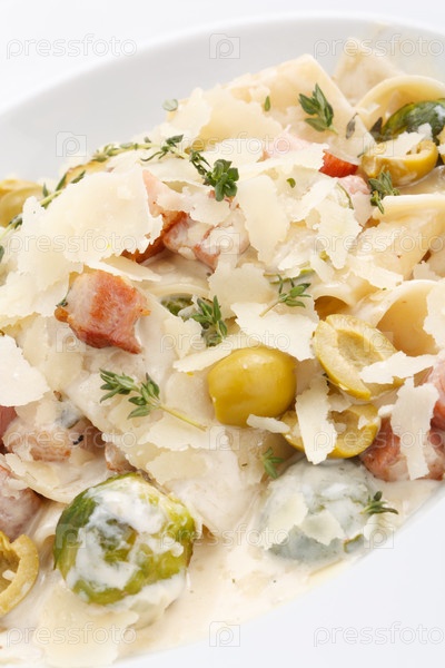 Макароны с беконом и овощами