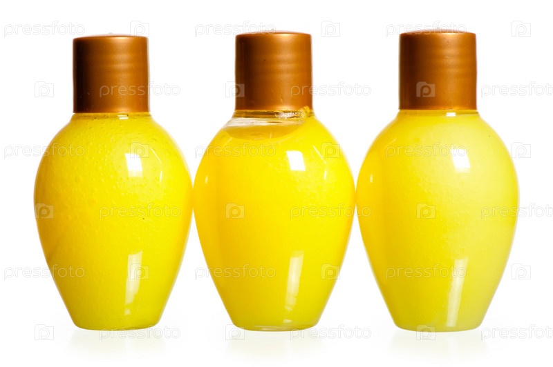 Три желтых бутылки косметики