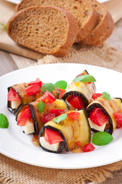 Рулеты из баклажанов, фаршированные сыром и ломтиками помидоров