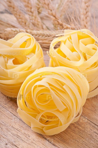 Макароны и колосья пшеницы на деревянном столе