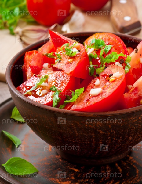 Салат из помидоров с базиликом, черным перцем и чесноком