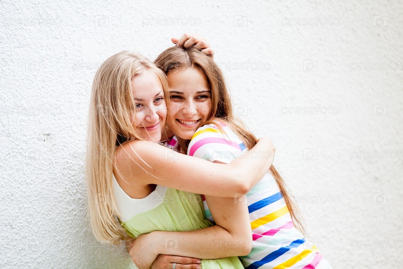 Девушки дурачатся на фоне стены