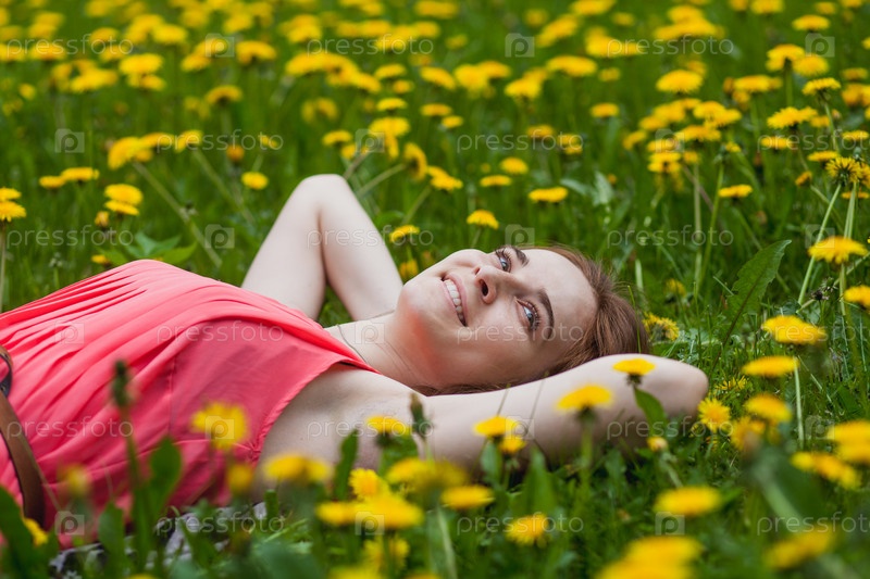 Красивая девушка, лежащая на поле одуванчиков