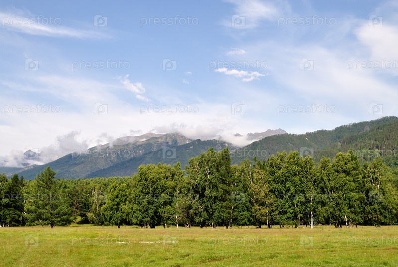Вид на поле, лес и горы