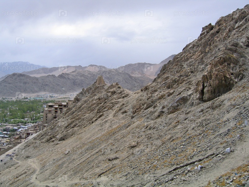 Вид на небольшой городок в горах Ладакха, Индия