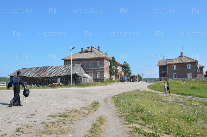 Соловки, монах идет по дороге к домам