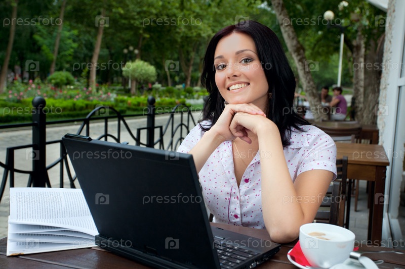 Портрет девушки в кафе с ноутбуком