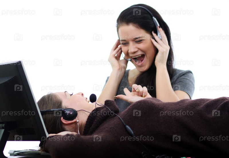 Две смеющиеся на белом фоне девушки с гарнитурой