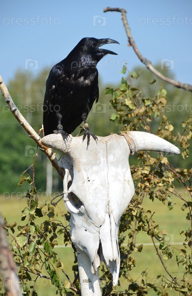 Черный ворон на черепе коровы летом в Подмосковье