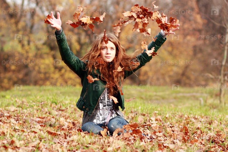 Брюнетка кидает сухие осенние листья