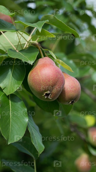 Красные груши на ветке на фоне зеленой листвы