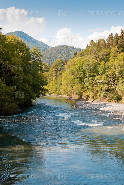 Бурная река в красивом горном ущелье