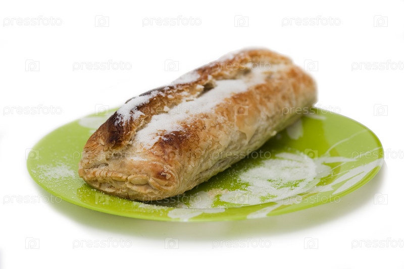 Слоеный пирожок в зеленой тарелке на белом фоне