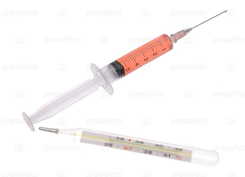 Медицинский термометр и шприц, наполненный лекарством