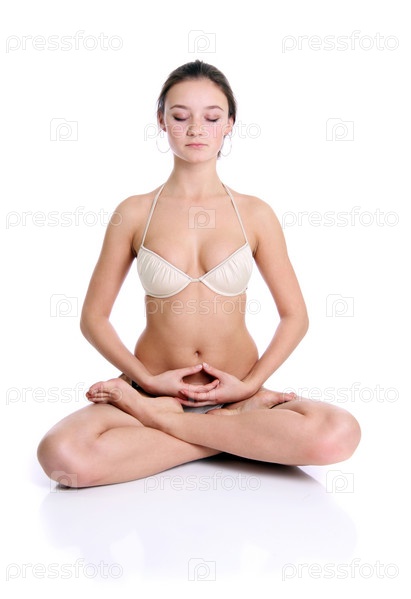 Молодая женщина занимается йогой на белом фоне