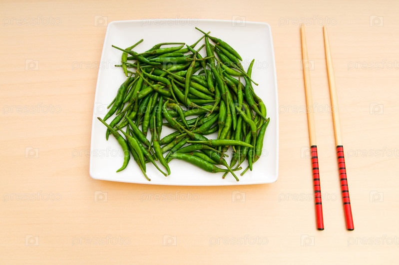 Стручки острого перца на тарелке и палочки