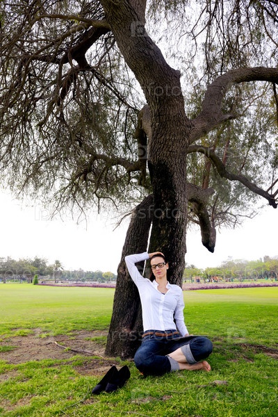 Красивая молодая женщина с планшетом в парке
