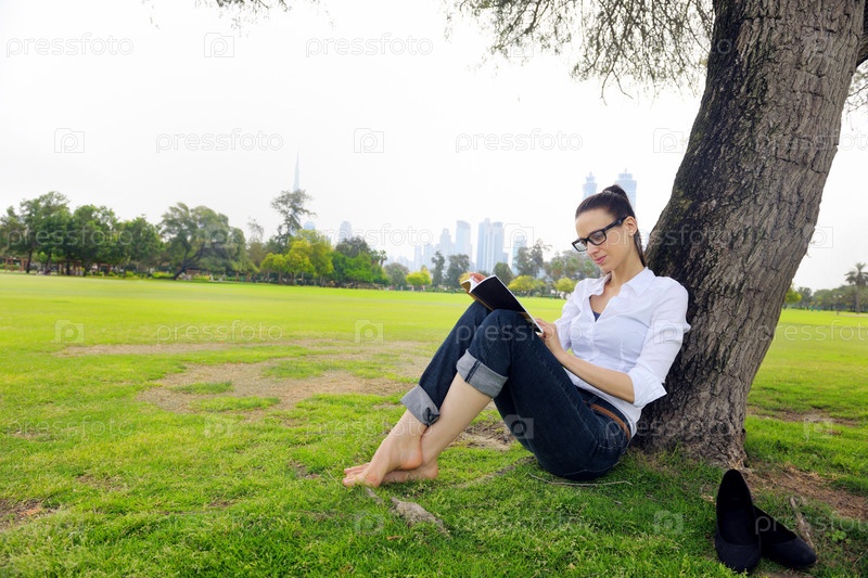 Молодая женщина читает книгу в парке