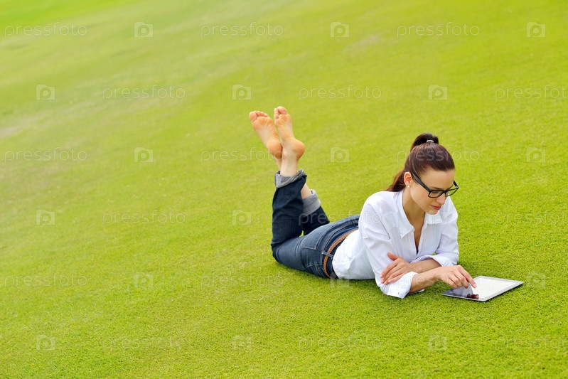 Красивая молодая женщина с планшетом в парке