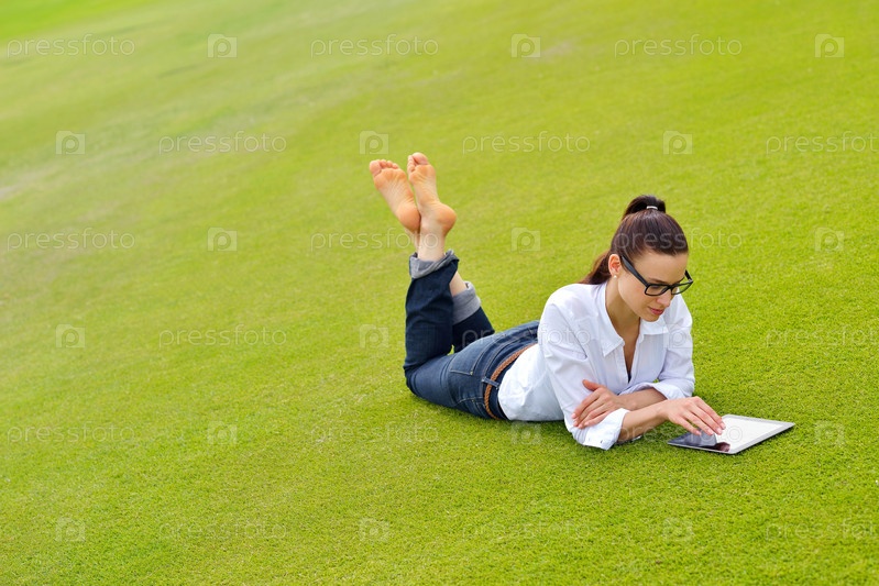 Красивая молодая женщина с планшетом в парке