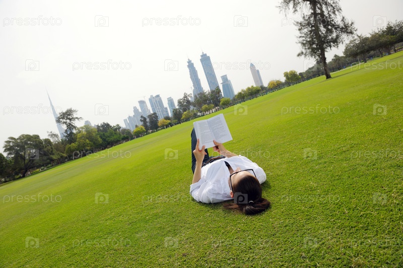 Молодая женщина читает книгу в парке