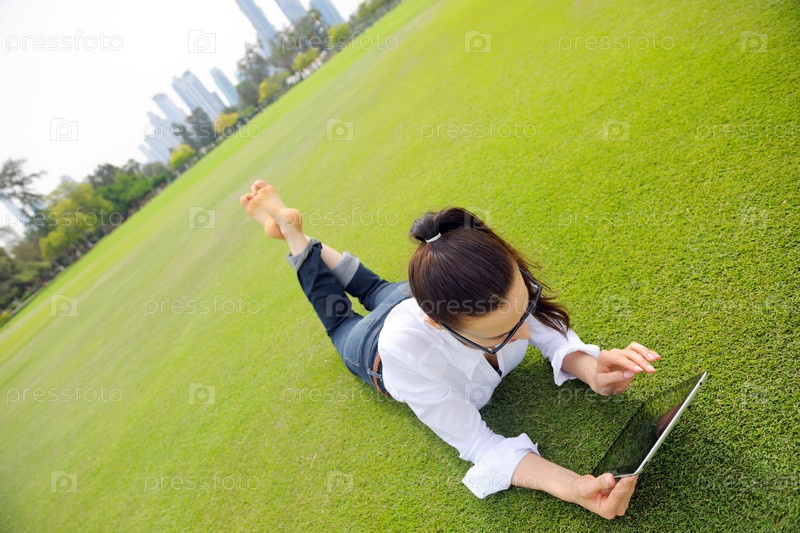Красивая молодая женщина с планшетом в парке