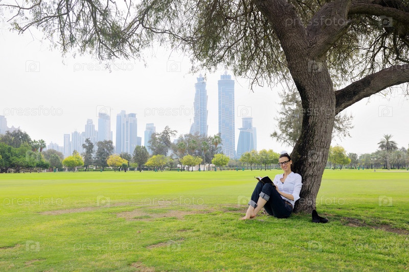 Молодая женщина читает книгу в парке