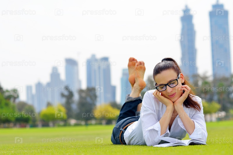Молодая женщина читает книгу в парке