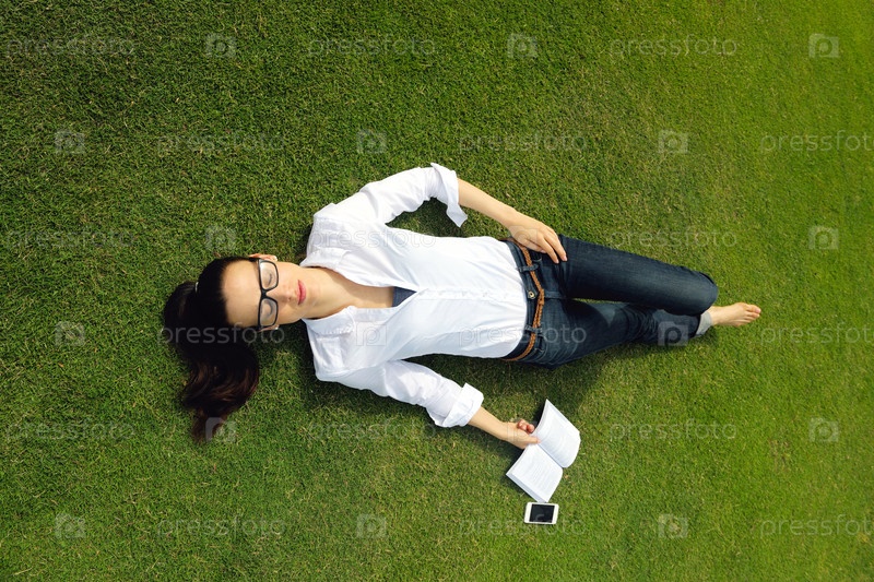 Молодая женщина читает книгу в парке