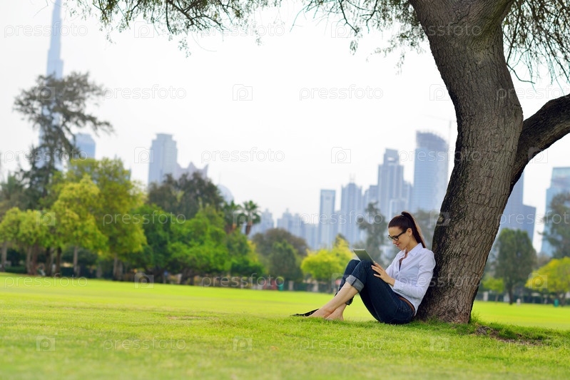 Красивая молодая женщина с планшетом в парке