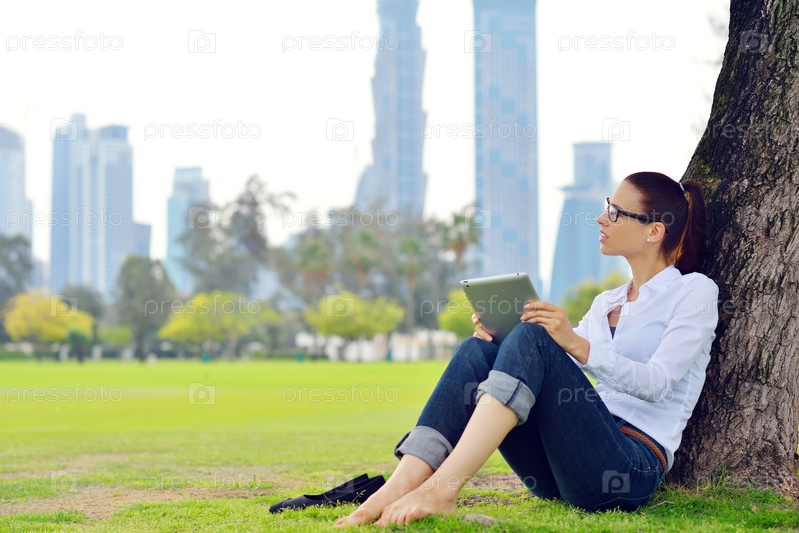 Красивая молодая женщина с планшетом в парке