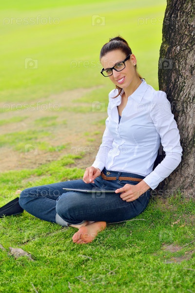 Красивая молодая женщина с планшетом в парке