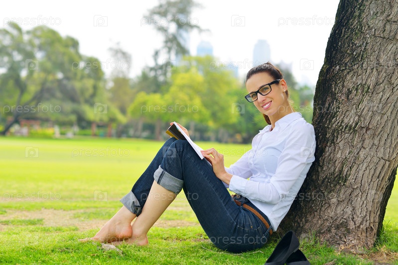 Молодая женщина читает книгу в парке