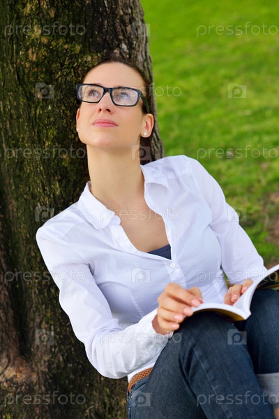 Молодая женщина читает книгу в парке