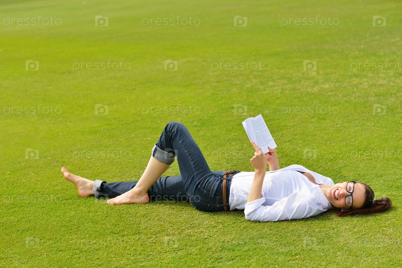 Молодая женщина читает книгу в парке