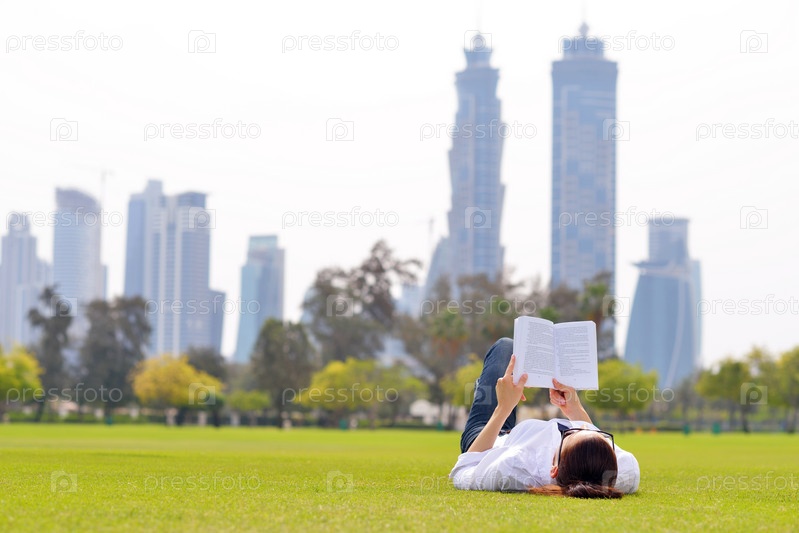 Молодая женщина читает книгу в парке