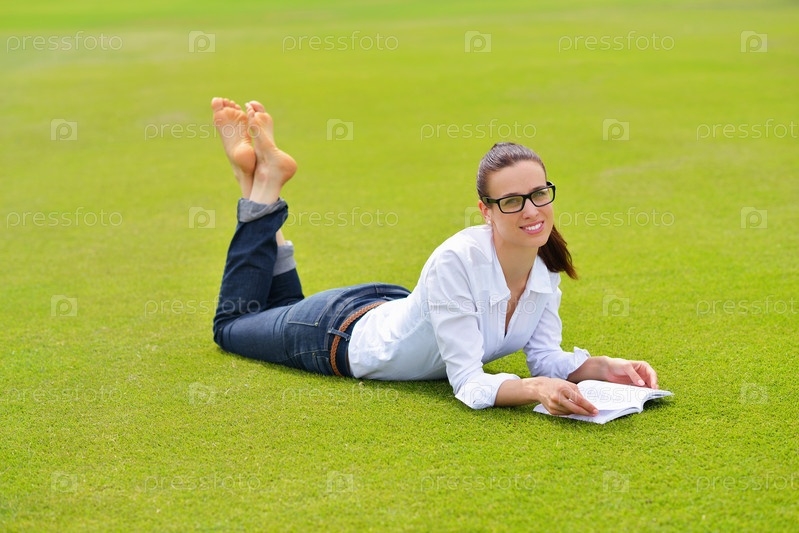 Молодая женщина читает книгу в парке