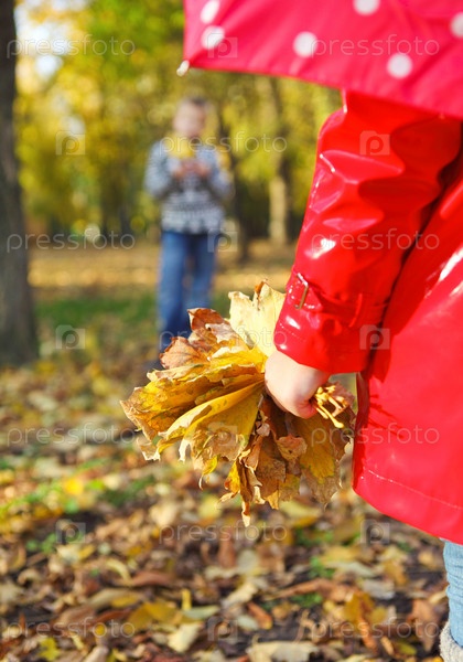 Маленькая девочка с осенними листьями в парке