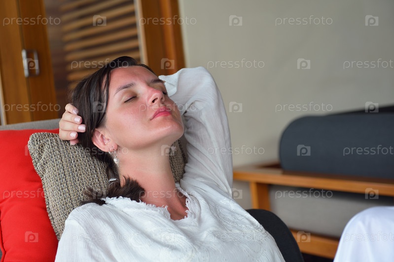 Счастливая молодая женщина отдыхает на диване дома