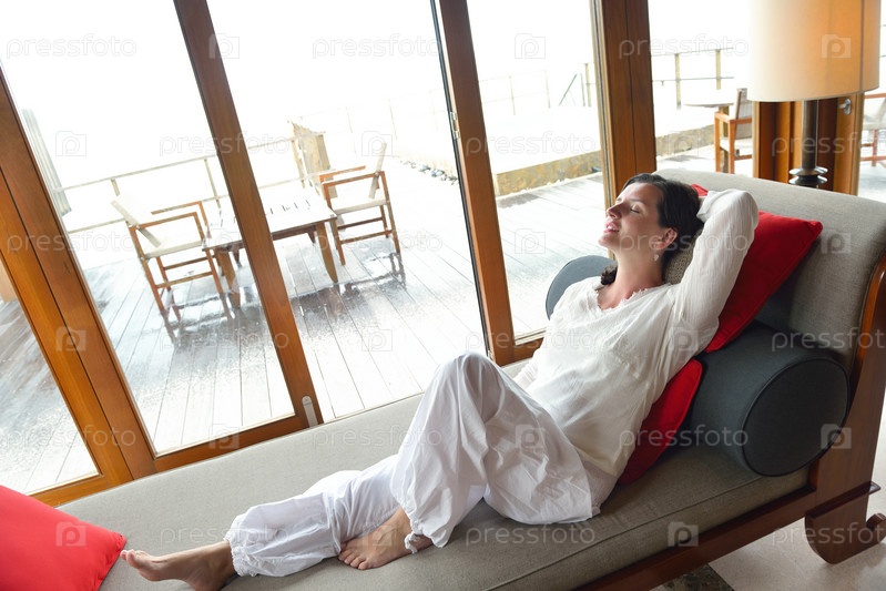 Счастливая молодая женщина отдыхает на диване дома