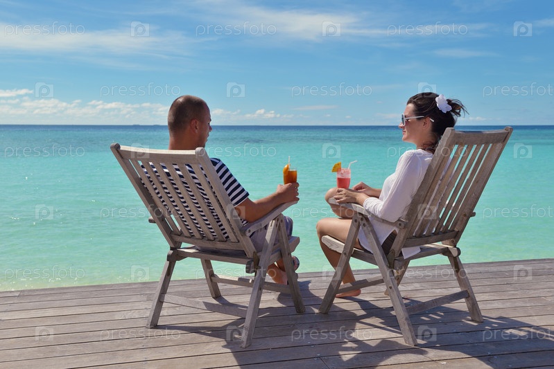 Счастливая молодая пара отдыхает и пьет прохладительные напитки