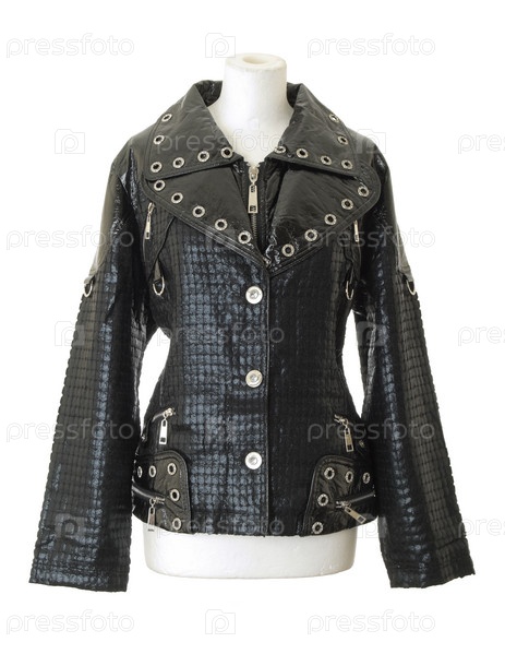 Черная женская кожаная куртка с множеством заклепок на белом манекене